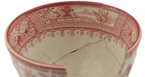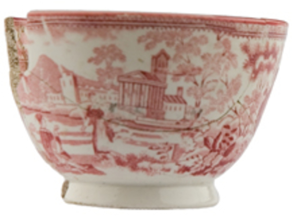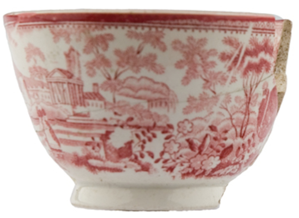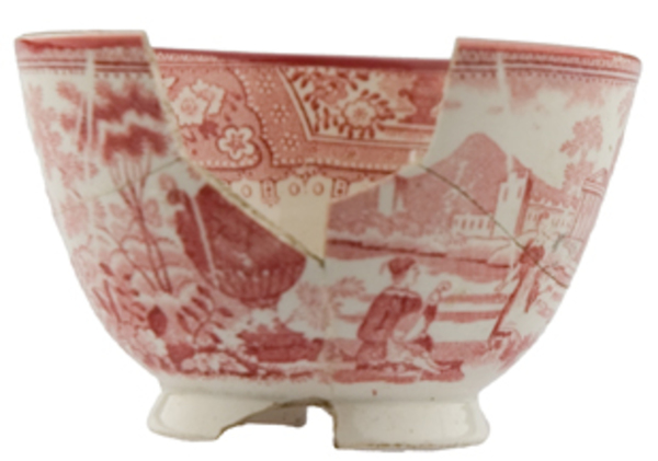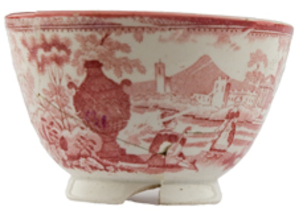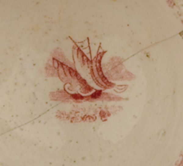 | 5c | inwendig: versiering met bloemen en panelen met zeilschip, uitwendig: onder rand bloemenversiering, daaronder tweemaal een grote vaas waaronder minstreel met dame als gehoor rood |