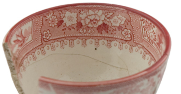 | 5c decoratie | inwendig: versiering met bloemen en panelen met zeilschip, uitwendig: onder rand bloemenversiering, daaronder tweemaal een grote vaas waaronder minstreel met dame als gehoor rood |