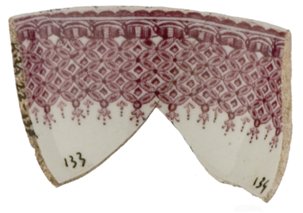 | 5c decoratie | inwendig: brede geometrische versiering, uitwendig: onder rand geometrische versiering, daaronder deel van Blind Fiddler scene paars |