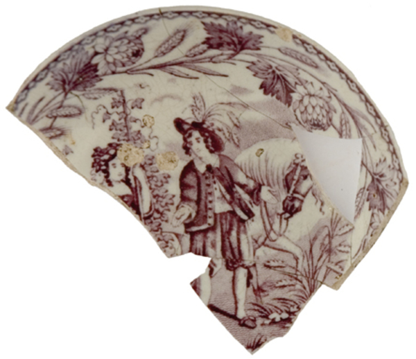 | 5c decoratie | Inwendig: versiering van gerstenaren, hopbellen en bladeren; op spiegel vrouw met staf en man met paard aan leidsel tussen hop- en gerstplanten inwendig: paars |