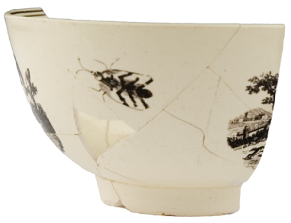 | 5c decoratie | inwendig: onder rand dubbel filet, op bodem fazant in boom, uitwendig: tweemaal een landschap waarvan één met fazanten, een insect tussen beide afbeeldingen zwart |