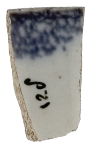 | 5c decoratie | inwendig: onder rand sponswerk, uitwendig: onder rand blauw sponswerk met daar doorheen horizontale groene blad inwendig: blauw, uitwendig: blauw en groen |