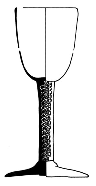 | 4b | eivormig of afgerond conisch kelkglas met lage kelk met dikwandige bodem en rechte massieve stam, ook met spiraalvormige draadversiering in stam, schijfvormige voet met pontilmerk |