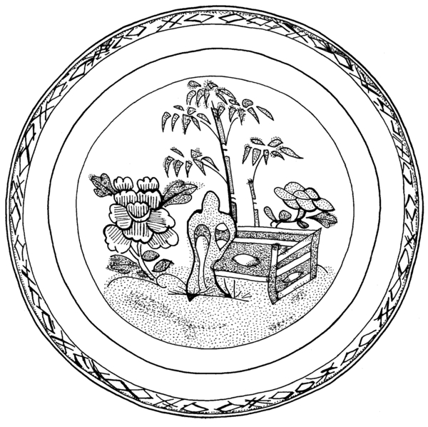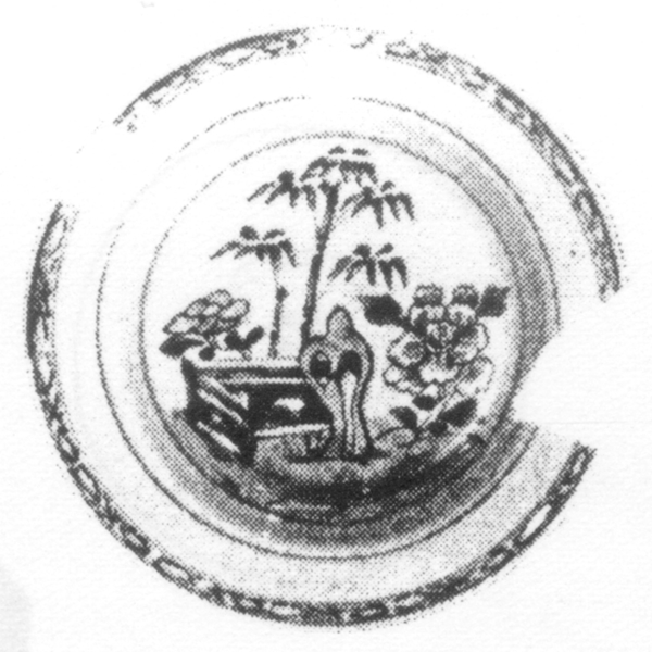 | 5c | blauw op wit, spiegel: Chinese tuin; vlag: geometrische motieven; rand bruin afgebiest onderglazuur blauw, bruin |