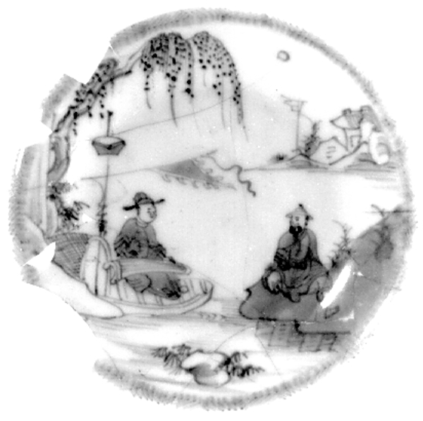 | 5c decoratie | inwendig: Chinezen in tuin en boot met lamp onderglazuur blauw |