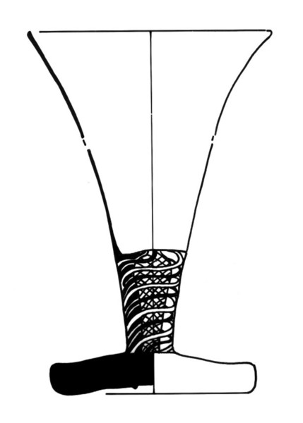 | 4b vorm | trechervormig kelkglas met dikwandige bodem, vloeiende overgang van stam naar kelk, ook met spiraalvormige draadversiering, dikwandige schijfvormige voet met pontilmerk |