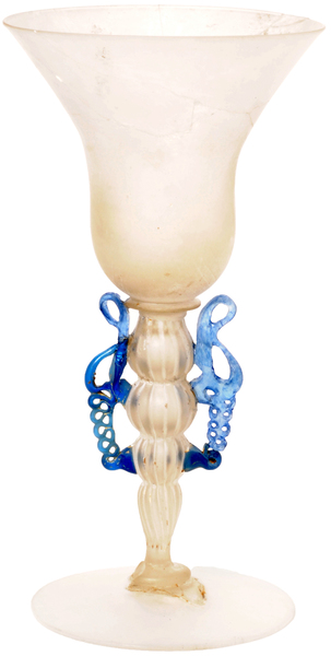 | 4b | conisch kelkglas met afgeronde bodem, met geribde stam in vier geledingen met vleugels, schijfvormige voet met pontilmerk |