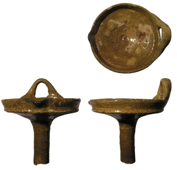 | 4b | olielamp met twee schalen en stam, 1 worstoor, lekschaal afgeplat, geknikte rand |