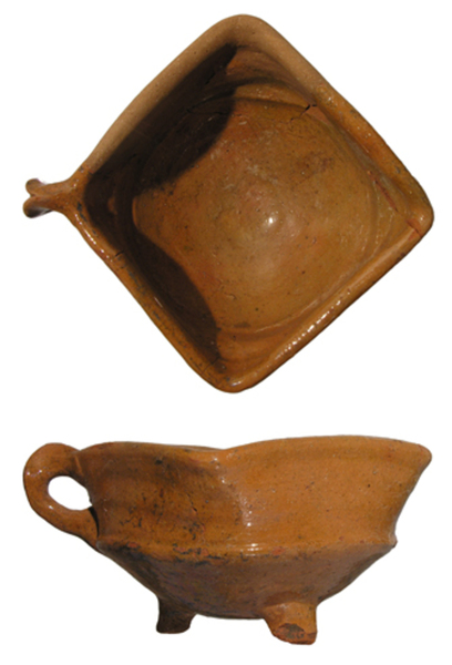 | 4b | vierkante vuurtest met scherpe knik bodem-wand en iets uitwijkende wand, afgeronde rand, poten |