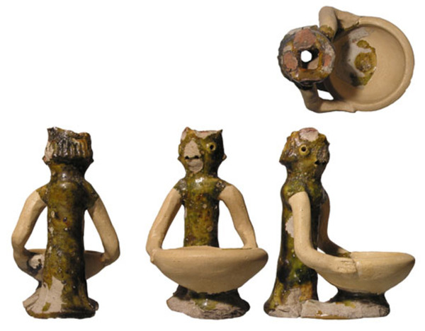 | 4b vorm | uit vrije hand geboetseerde mansfiguur met komvormige olie lamp |
