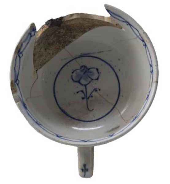 | 5c | inw.: onder rand filet van guirlandes, op bodem bloementak binnen cirkel; uitw.: tussen twee horizontale filets vier panelen met een bloemmotief met ranken blauw |