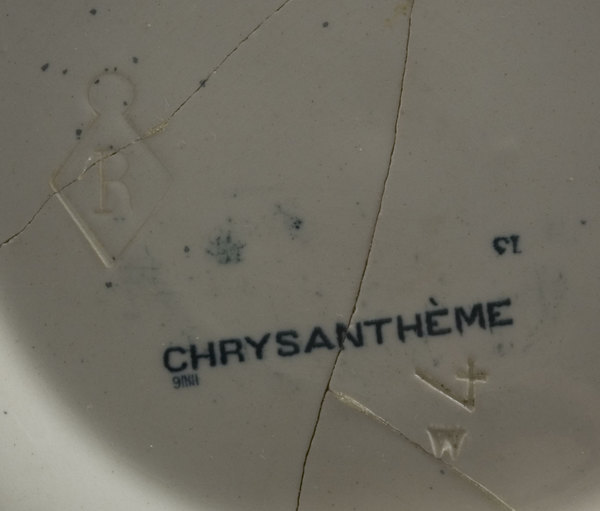 | 5d | beeldmerk: CHRYSANTHÉME; blindmerk: Polling 10b, twee driehoekjes en cijfer 4 onderbord voor lampetkan Petrus Regout |