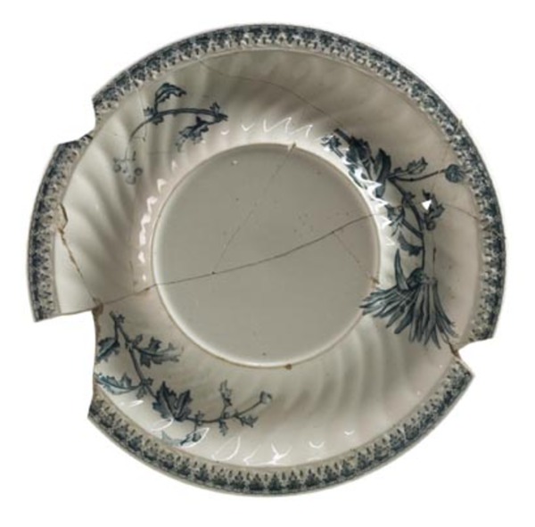 | 4b | ronde onderschotel voor jus- of sauskom of terrine, geknikte, smalle uitstaande vlag met rechte rand, verhoogd middendeel met pasrand voor het erin te plaatsen voorwerp, standring |