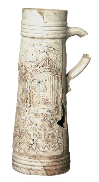 | 5c decoratie | drie appliques met wapens: het wapen van Spanje (Philips II) met een keten van het Gulden Vlies, het wapen der Habsburgers met de rijksadelaar en een keten van het gulden Vlies |