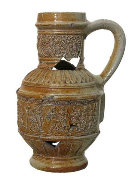 | 5c decoratie | ingesneden decoratie en applique met daarop voorstellingen van boerendans (GERET DV MVSD)APR BLASEN SO DANSEN DEI (BYREN ALS WEREN S)EI RASEN FRI VF SPRICHT BASTOR ICH VER DANS DI KAP MI(T EN KOR 15)83 |