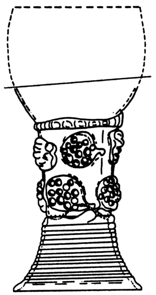 | 4b | roemer met ei- of tonvormige cuppa, geribde draad op de overgang naar de schacht en één of meer verspringende rijen braamnoppen, opgestoken bodem met pontilmerk, gewonden draadvoet |