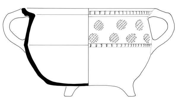 | 4b | wijde tonvormige grape met scherpe buikknik en uitstaande kraagrand met dekselgeul, vlakke bodem met poten |