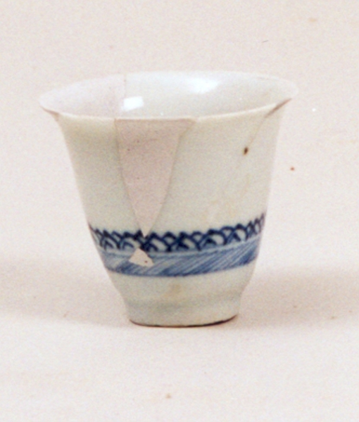 | 5c decoratie | blauw op wit beschildering, geometrische fries onderlangs buitenwand onderglazuur blauw |