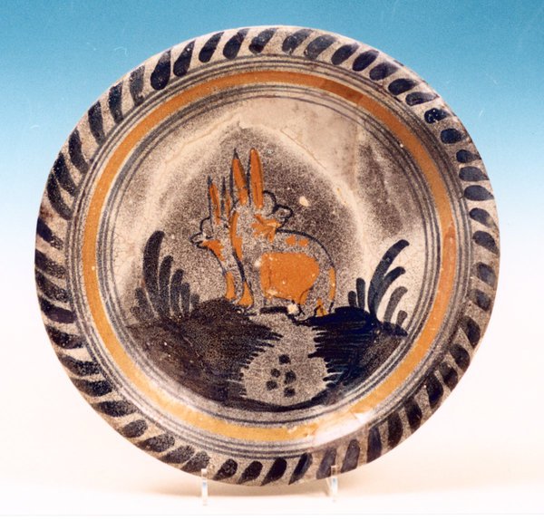 | 5c decoratie | beschildering in blauw en oker, spiegel: twee hazen in landschap binnen concentrische cirkels, kabelrand inwendig: polychroom |