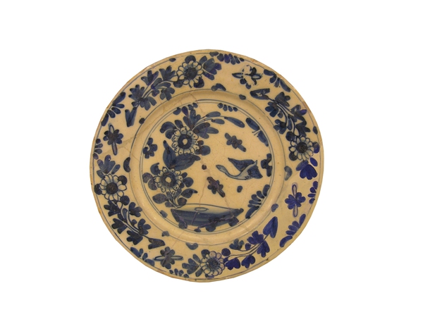 | 5c decoratie | beschildering in blauw op wit, spiegel: bloemen en vogel decor naar Chinees voorbeeld; vlag: bloemenfries blauw |