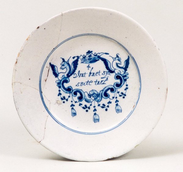 | 5c decoratie | beschildering in blauw op wit, spiegel: spreuk: '4 wat baet syn soete tael ', omgeven door guirlandes en grotesken spreukbord blauw |