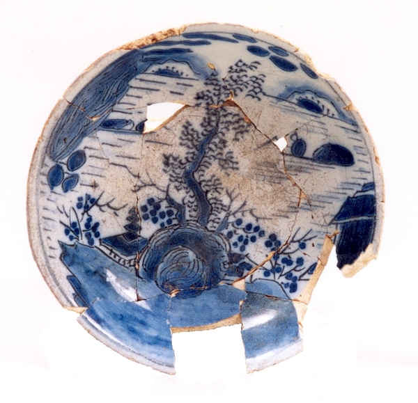 | 5c | beschildering in blauw op wit, spiegel: Chinees landschap met rots blauw |