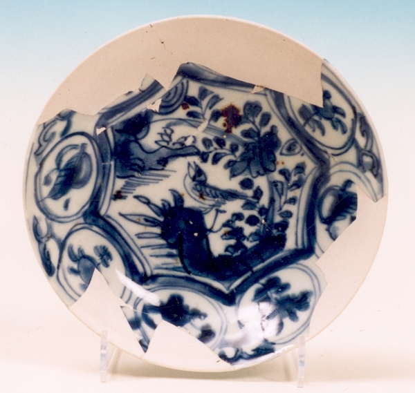 | 5c | blauw op wit beschildering: vogel op rots met omlijsting in wan-li stijl onderglazuur blauw |