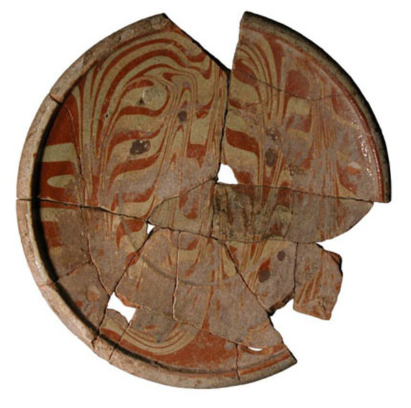 | 5a baksel | roodbakkend aardewerk , met slibversiering |
