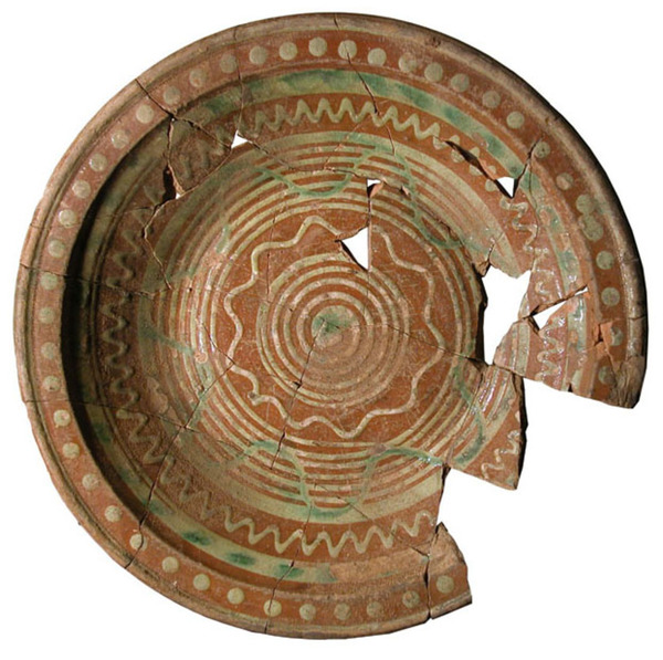 | 5a baksel | roodbakkend aardewerk , met slibversiering |