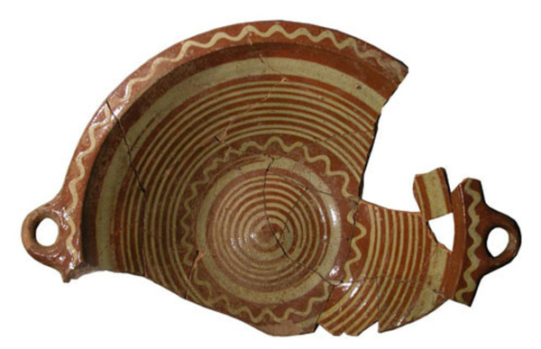 | 5a baksel | roodbakkend aardewerk , met slibversiering |