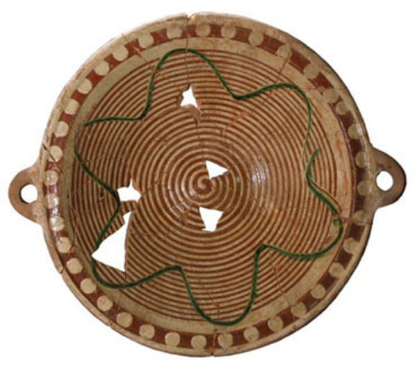 | 5a baksel | roodbakkend aardewerk , met slibversiering |