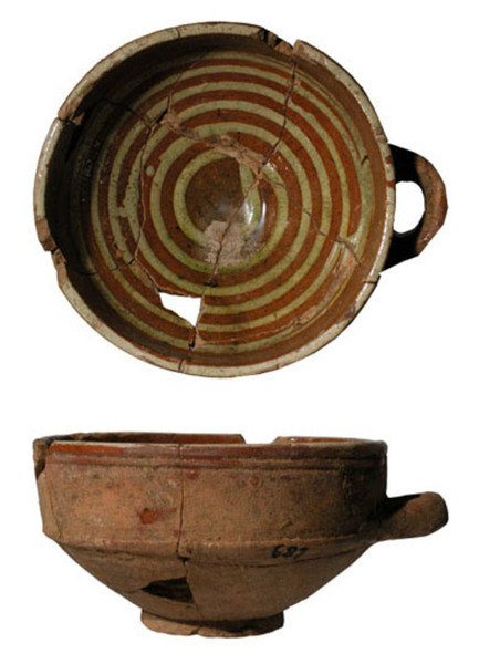 | 5a baksel | roodbakkend aardewerk , met slibversiering |