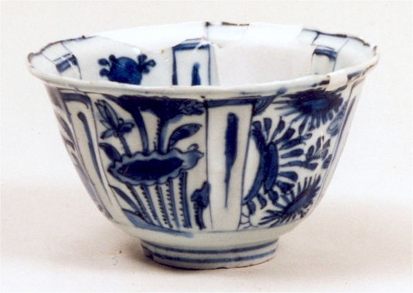 | 5c | blauw op wit beschildering, zijwand binnen- en buitenzijde: Boeddhistische symbolen in vakverdeling; binnenzijde: op bodem vogel op rots ('kraaienkom') onderglazuur blauw |