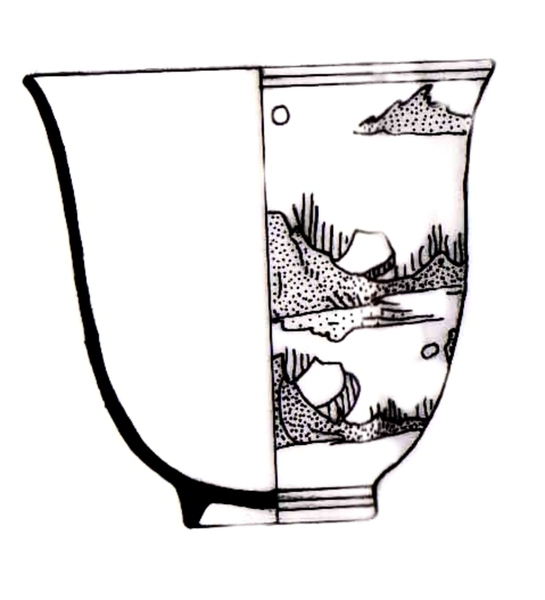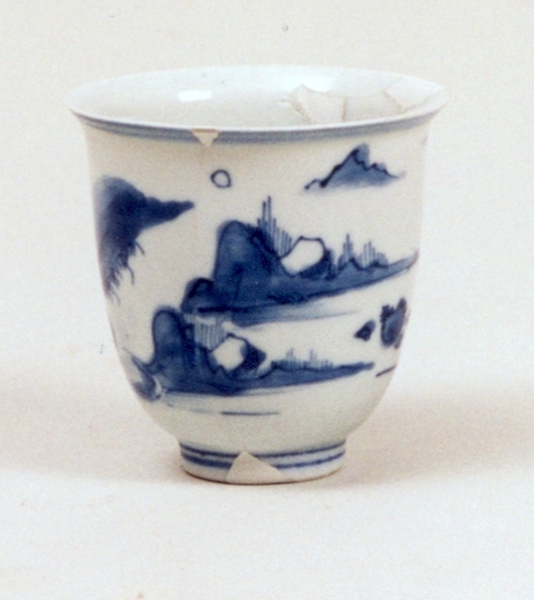 | 5c | blauw op wit beschildering, buitenzijde: Chinees landschap onderglazuur blauw |