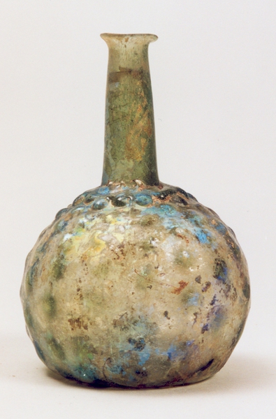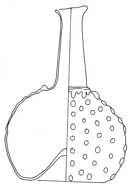 | 4b | kleine bolvormige fles met reliëfpatroon van bobbels, schubben of ribben, opgestoken bodem met pontilmerk |