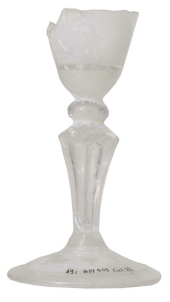 | 4b | trechtervormig kelkglas met dikwandige bodem veelzijdige stam van vijf of meer zijden met luchtbel, ook met diamanten op de schouders, voet met pontilmerk |