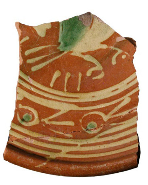 | 5a baksel | roodbakkend aardewerk , met slibversiering |