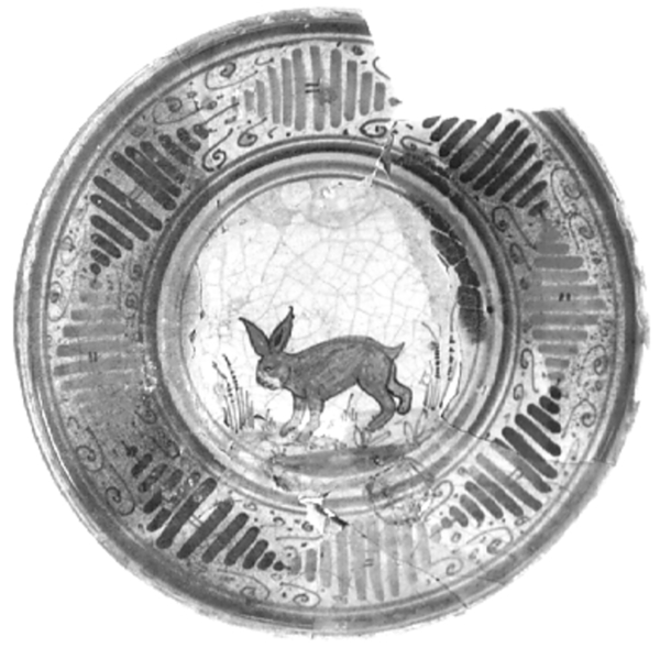 | 5c decoratie | vlag: fantasie ornament; spiegel: konijn binnen vijf cirkels inwendig: polychroom |