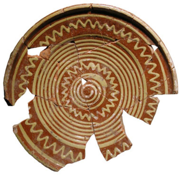| 5a baksel | roodbakkend aardewerk , met slibversiering |