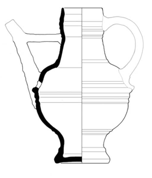 | 4b | bolle tuitkan met hoge buik, hoge schenktuit op buik recht tegenover het oor d.m.v.brug verbonden aan hals, ribbel op buik en cilindrische hals met kraagrand, ribbels op halsaanzet en op hals, op standvoet (als S2-kan-37) |