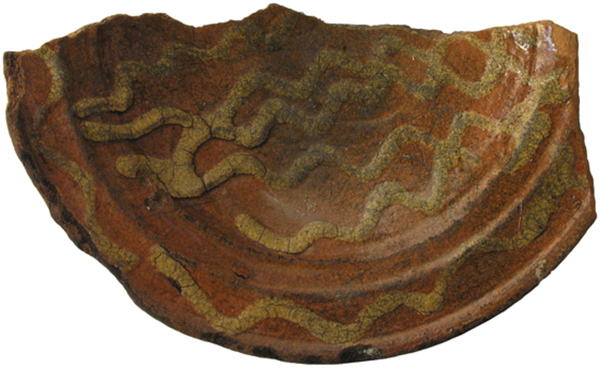 | 5c decoratie | witte slibdecoratie, ringeloor: slingerlijnen dwars over spiegel en langs de rand |
