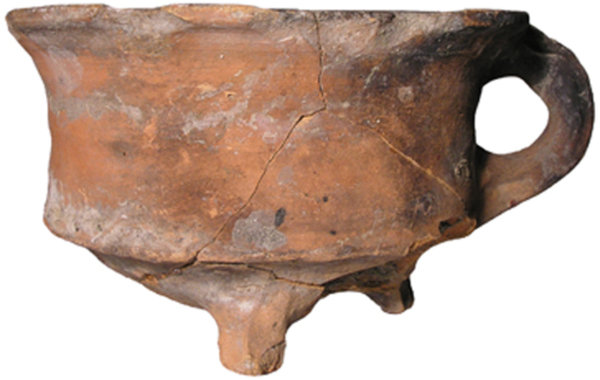 | 4b | ronde vuurtest met scherpe knik bodem-wand en rand met aan bovenzijde een geultje, poten |