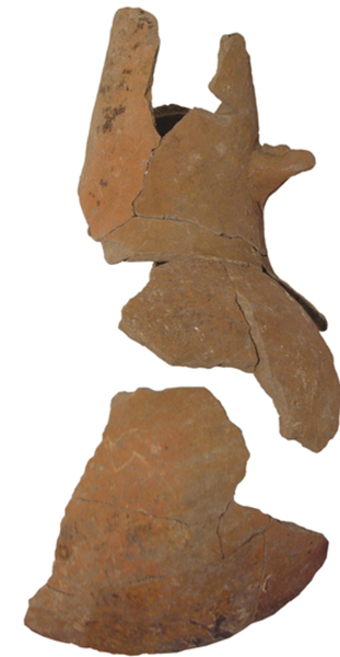 | 4b | peervormige spreeuwenpot met doorboorde nok voor stokje, roofgat aan afgeplatte zijde, met ophangoor |