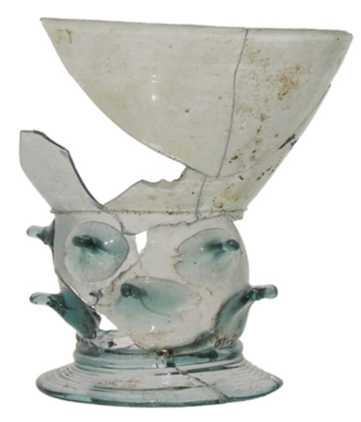 | 4b | roemer met conische cuppa, draad op de overgang naar de schacht en twee of meer verspringende horizontale rijen puntnoppen, opgestoken bodem met pontilmerk, gewonden draadvoet |