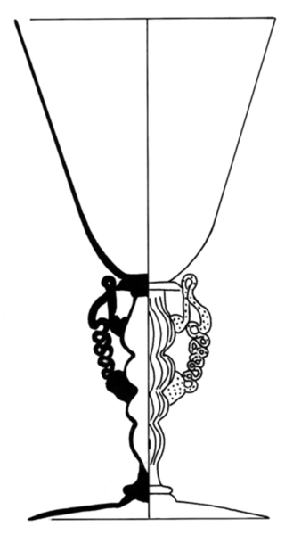 | 4b | conisch kelkglas met afgeronde bodem, met geribde stam in vier geledingen met vleugels, schijfvormige voet met pontilmerk |