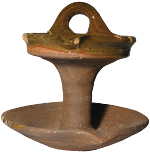 | 4b | olielamp met twee schalen en stam, een worstoor, lekschaal afgeplat, geknikte rand |