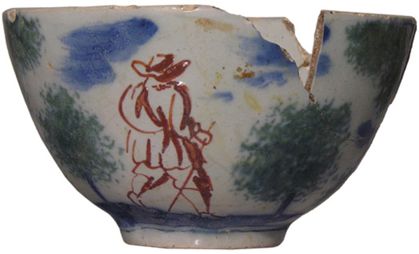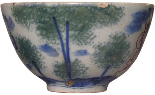 | 5c decoratie | decoratie in groen, en blauw, en bovenglazuur rood ; inwendig: blaadje; uitwendig: bomen met wandelend mannetje en staand vrouwtje polychroom |