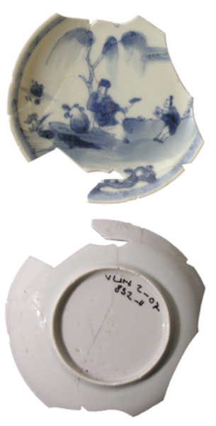 | 5c | spiegel: mandarijn tegen boom in landschap; vlag: omlijsting onderglazuur blauw |