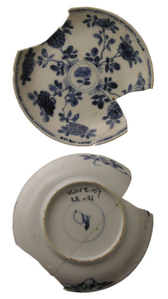 | 5c | decoratie in blauw, spiegel/vlag: rozen in geometrische compositie; vlag-buiten: losse vegetale elementen onderglazuur blauw |