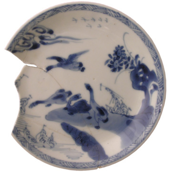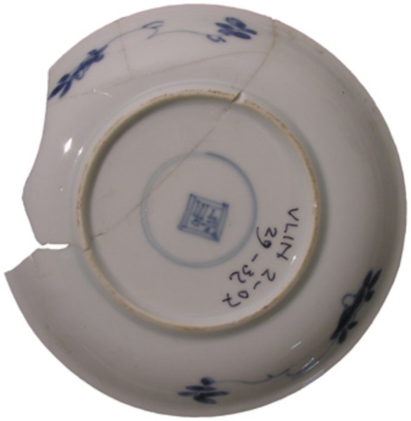 | 5c | decoratie in blauw, inwendig: landschap met eenden, vlag met zigzaglijntjes; uitwendig losse bloemen onderglazuur blauw |